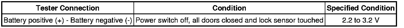 When measuring the battery voltage, while operating the lock sensor of a door handle, bring the card key within entry operating range to perform the measurement. For the entry operating range, refer to System Description System Description.