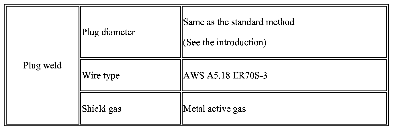 NOTICE: Be sure to use Metal active gas (Ar 80% + CO2 20%) as the shield gas when plug welding. Sufficient weld strength cannot be assured when using 100% CO2 shield gas.