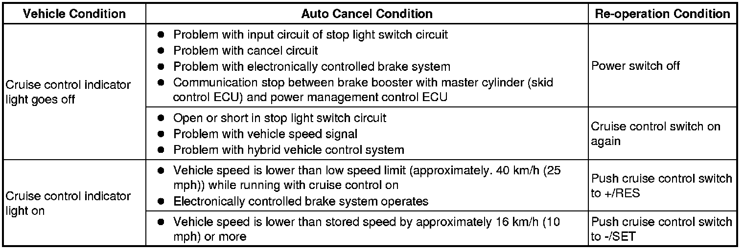 If the following conditions are detected while cruise control is operating, the system clears the vehicle speed stored in the hybrid vehicle control ECU and cancels the cruise control operation.