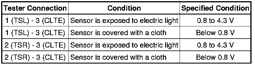 * The connection procedure for using a digital tester such as a TOYOTA electrical tester is shown above. When using an analog tester, connect the positive (+) lead to terminal 3 and the negative (-) lead to terminal 1 (2) of the automatic light control sensor (solar sensor).