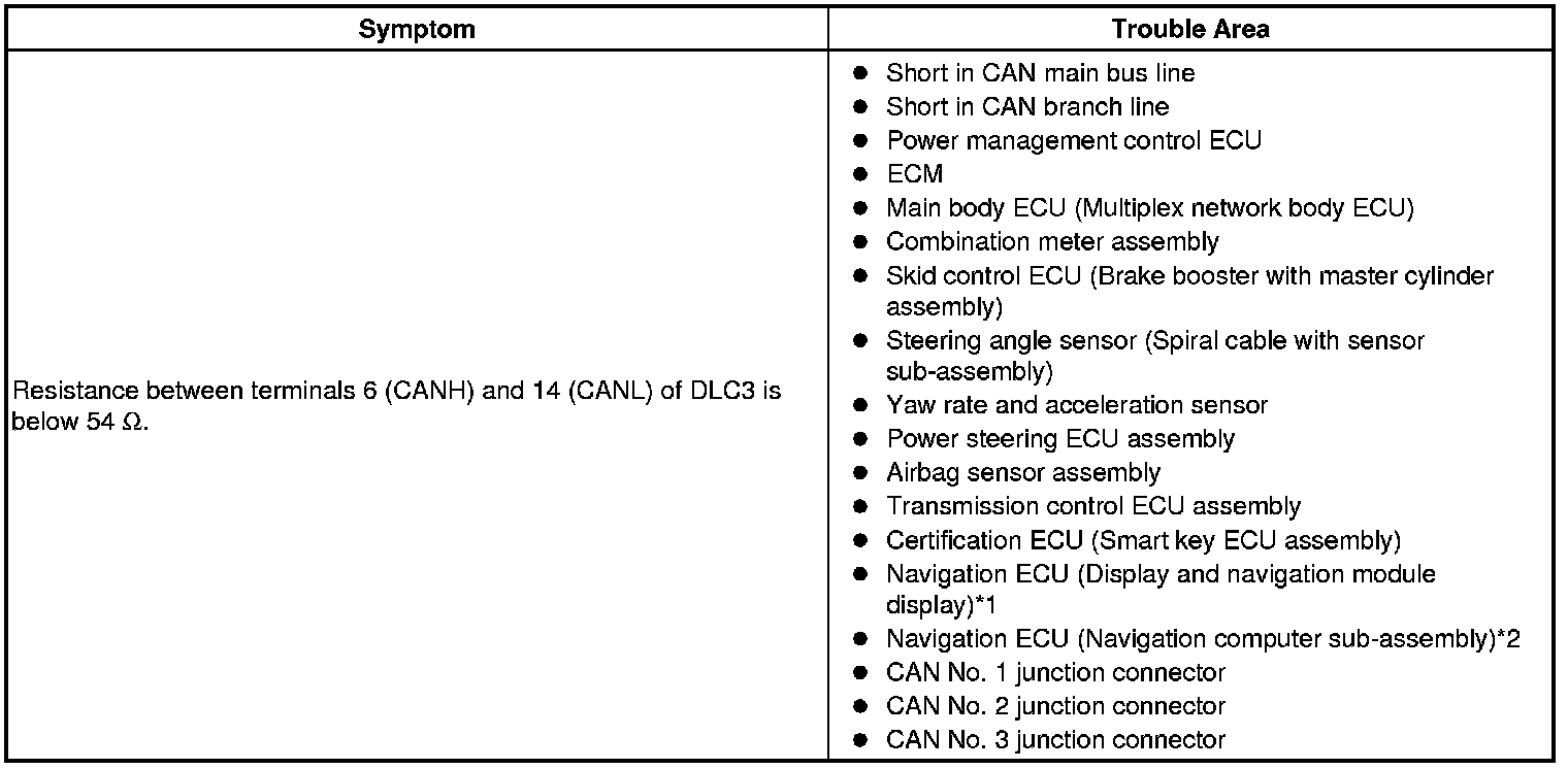 There may be a short circuit between the V1 bus main lines and/or CAN branch lines when the resistance between terminals 6 (CANH) and 14 (CANL) of the DLC3 is below 54 Ohms.
