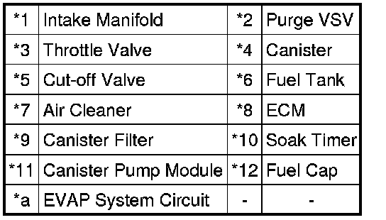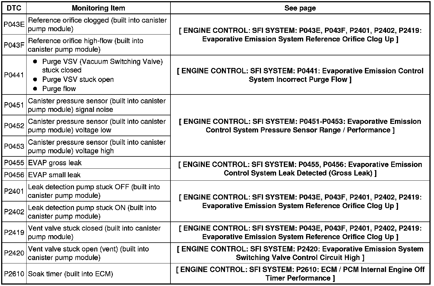 If any EVAP system DTCs are output, the malfunctioning area can be determined using the table below.