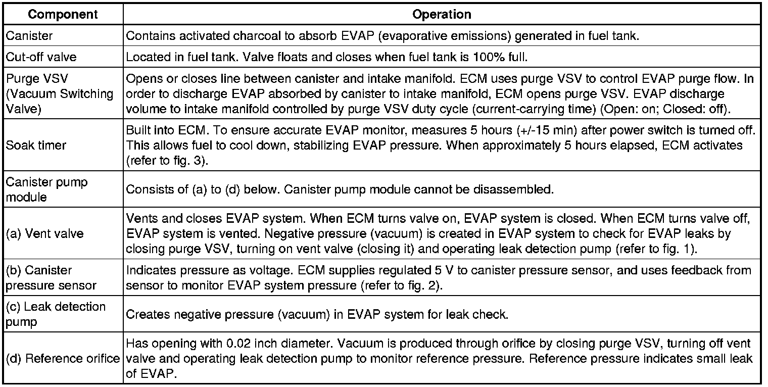 The leak detection pump creates negative pressure (vacuum) in the EVAP system and the pressure is measured. Finally, the ECM monitors for leaks from the EVAP system, and malfunctions in both the canister pump module and purge VSV based on the EVAP pressure.
