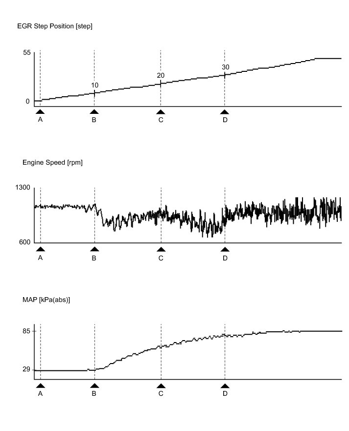 * Usually, when the control value for Control the EGR Step Position is changed from "0 step" to "30 step", the value of MAP increases to a value at least 10 kPa higher than the value of MAP when the control value for Control the EGR Step Position was "0 step", and the engine idles roughly or stalls.