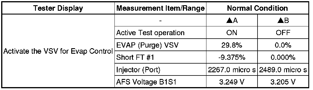Even when the Active Test is turned on (the purge VSV is opened 30%), air-fuel ratio feedback continues and control is performed so that the air-fuel ratio is the stoichiometric ratio. Therefore, by observing the change in "Short FT", it is possible to determine whether the purge VSV is actually open as well as the concentration of HC in the purge gas.