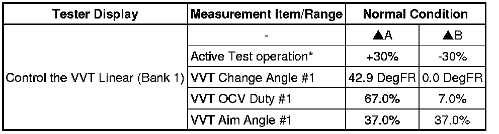 * The Control the VVT Linear Active Test considers the value of VVT Aim Angle to be 0 and raises or lowers the duty ratio with respect to VVT Aim Angle #1.