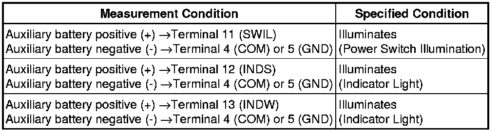 (b) Apply battery voltage between the terminals of the switch, and check the illumination condition of the power switch.