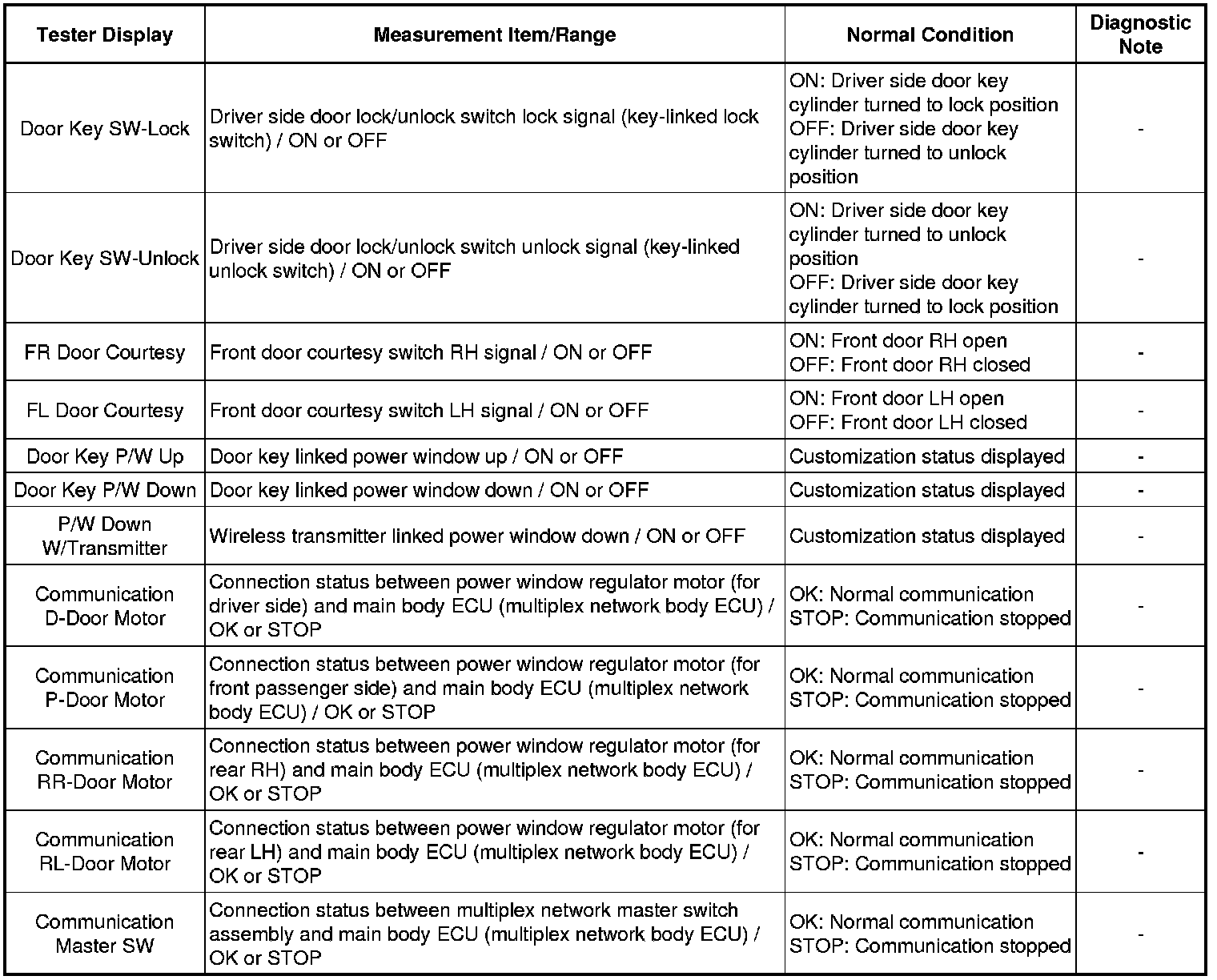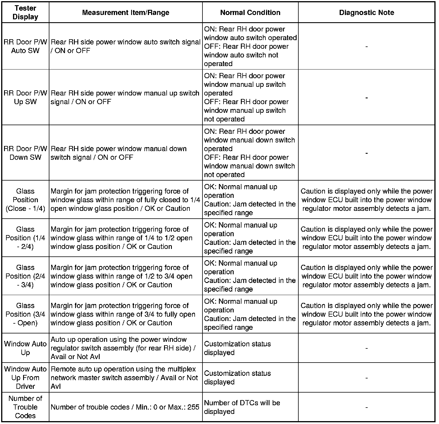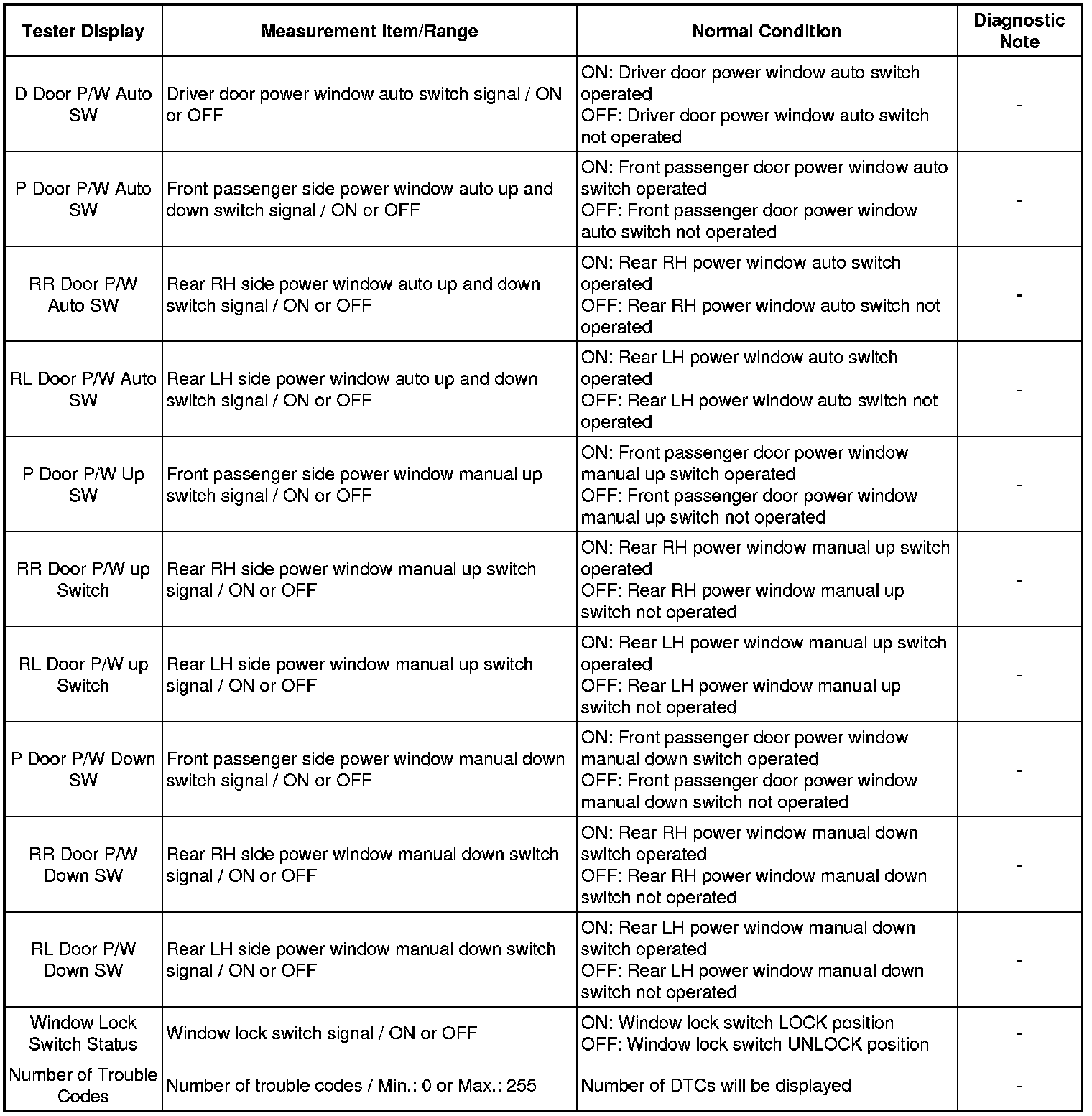 WINDOW / GLASS: POWER WINDOW CONTROL SYSTEM: DATA LIST / ACTIVE TEST