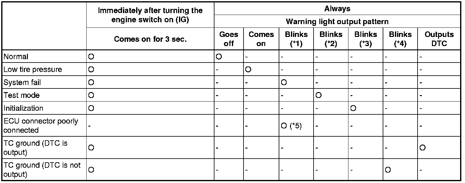 The table below indicates the state of the tire pressure warning light after the engine switch is turned on (IG).