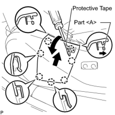 (a) Hook a screwdriver to part A to bend it toward the inside of the cabin and release the claws. Pull the seat belt anchor cover cap RH upward and remove it.