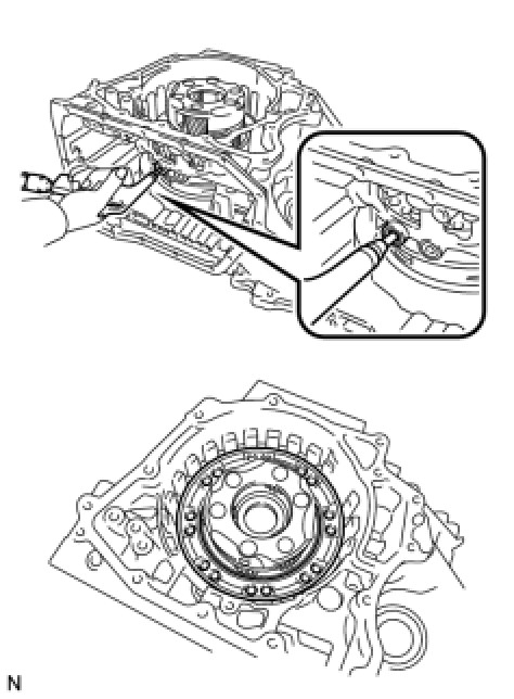 (a) Apply compressed air (392 kPa, 4.0 kgf/cm2, 57 psi) to the ATF hole indicated by the arrow to remove the No. 2 brake piston assembly from the transaxle case.