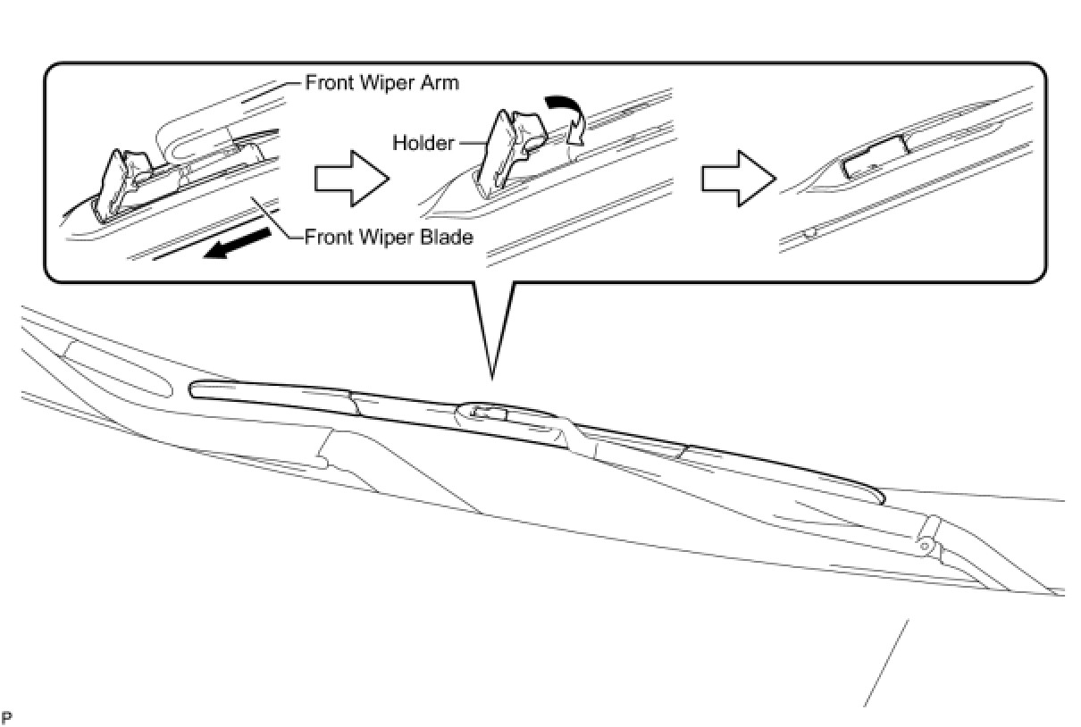 (b) Install the wiper rubber to the front wiper blade with the tip of the rubber (curved end) facing the axis of the wiper arm.