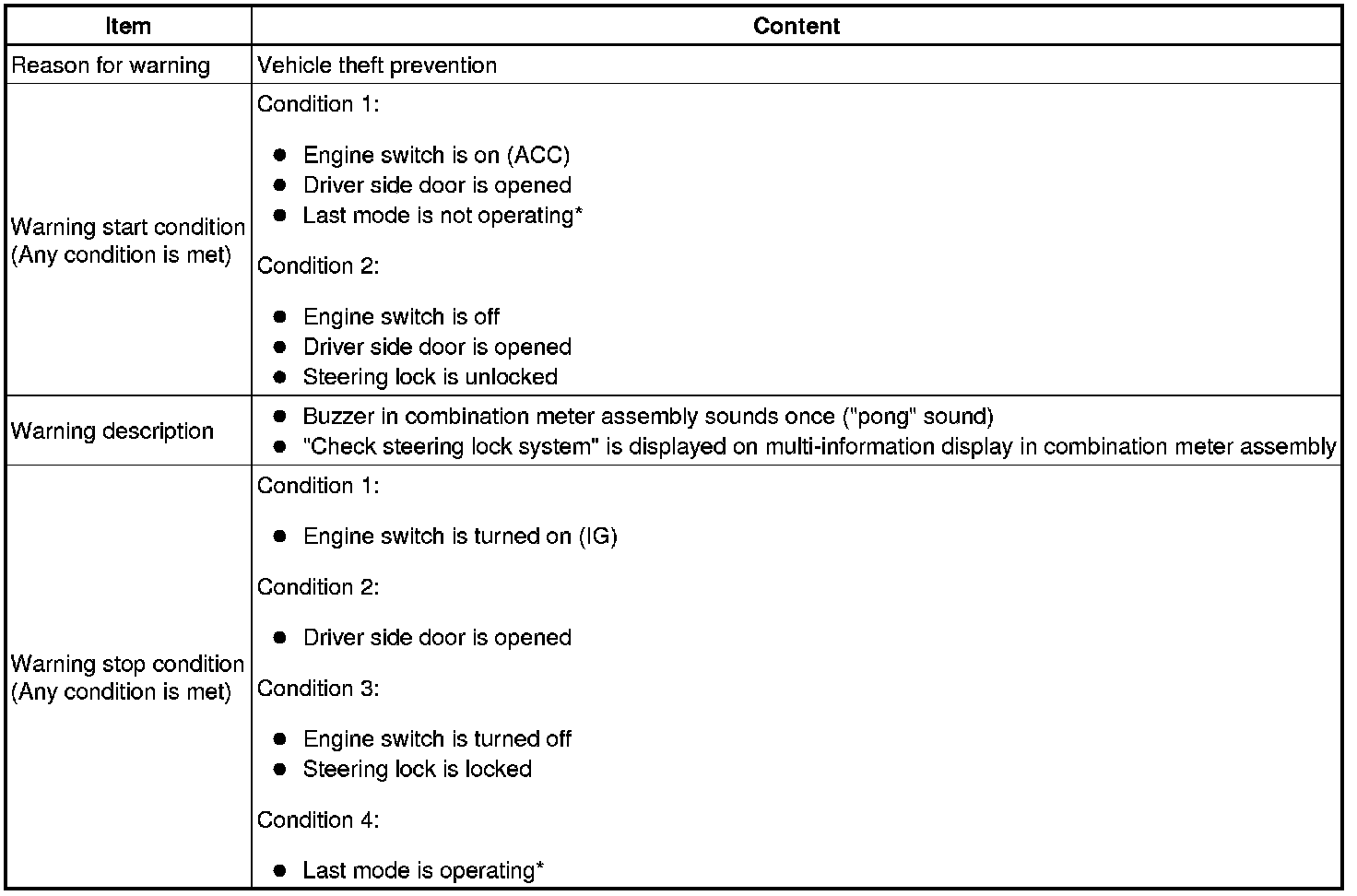 (1) The driver side door is opened and vehicle exit is attempted while the steering lock is unlocked.