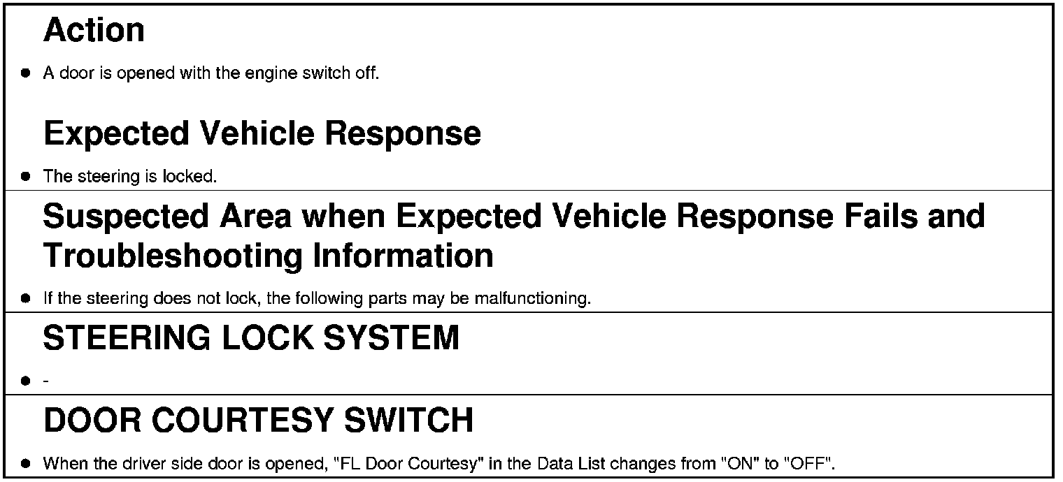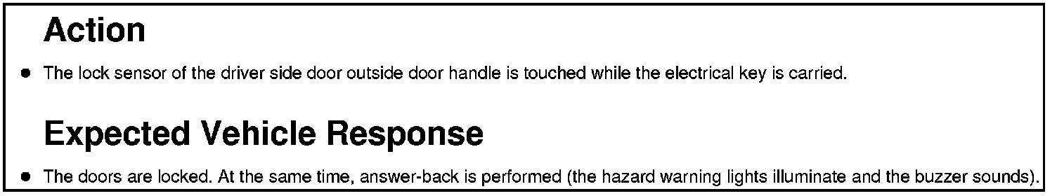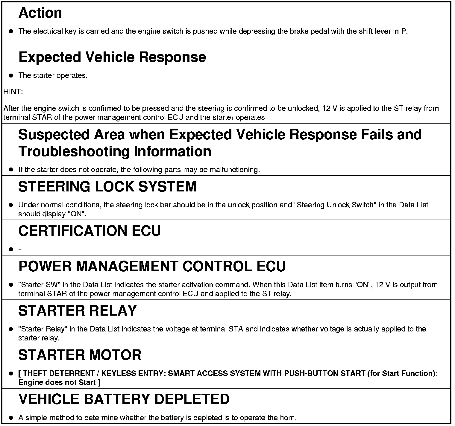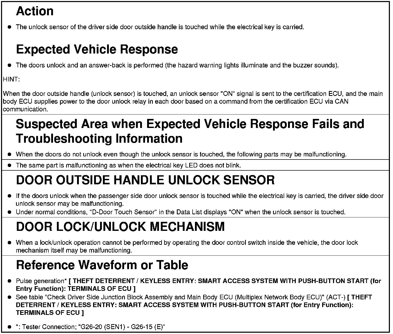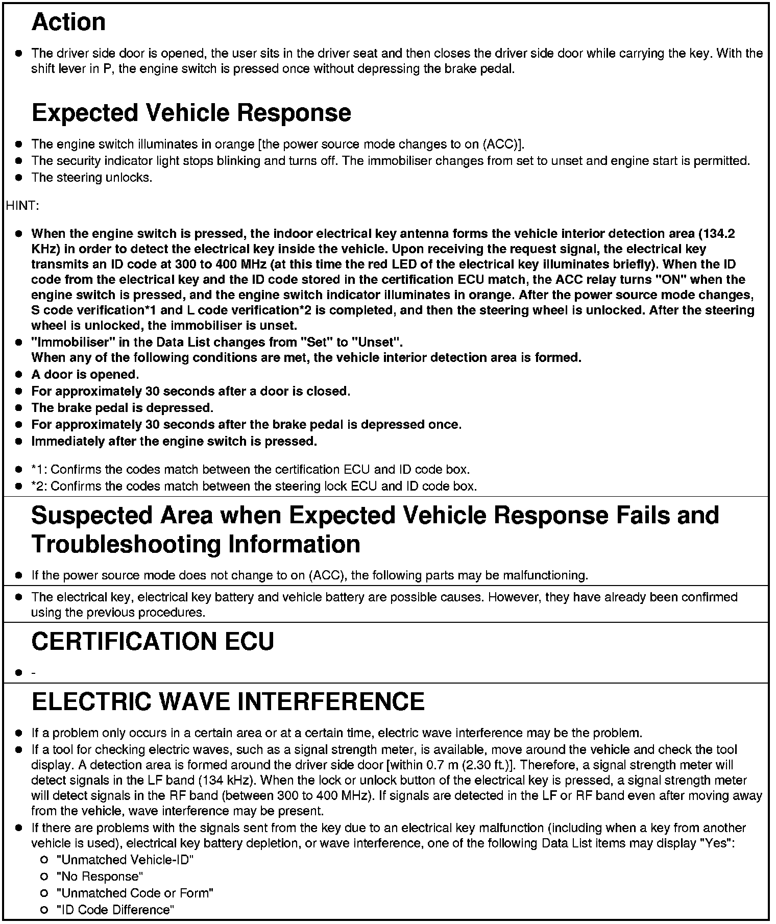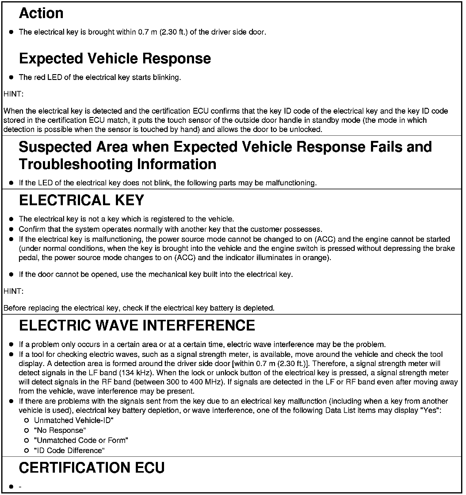 * The following example shows how the information in this section is organized. The "Action" item indicates actions the user performs related to the entry and start system, and the "Expected Vehicle Response" item indicates the normal vehicle behavior in response to those actions. The suspected problem areas when the vehicle does not behave as expected and troubleshooting hints for each area are listed under "Suspected Area when Expected Vehicle Response Fails and Troubleshooting Information".