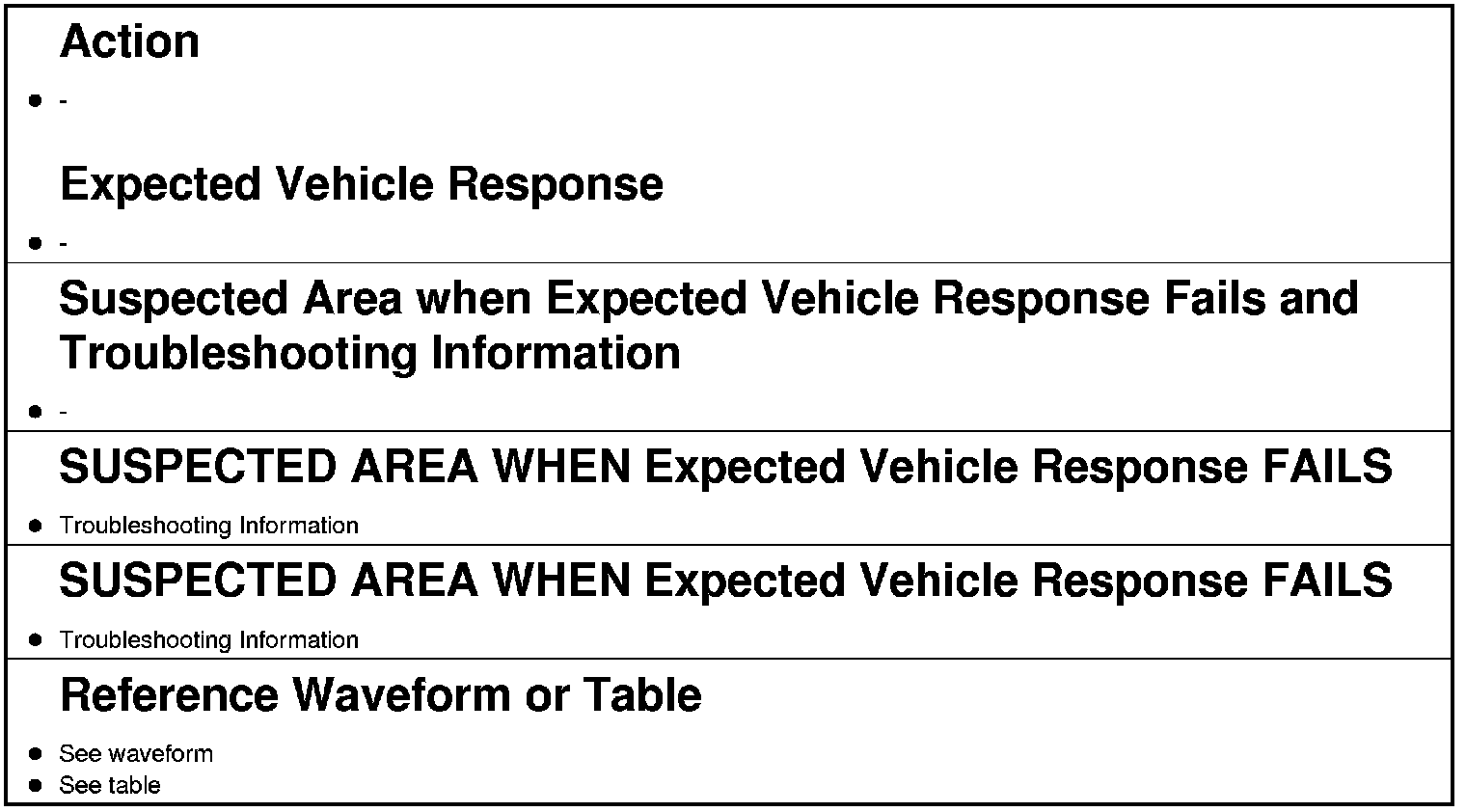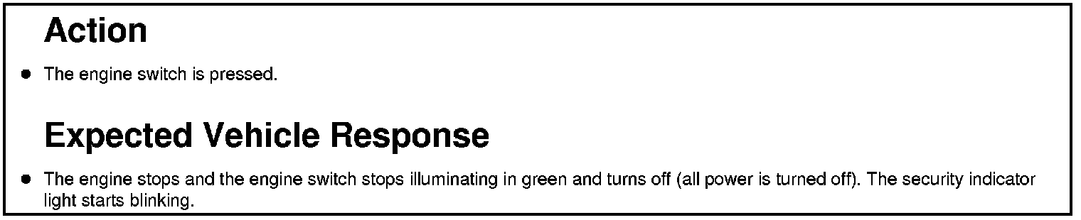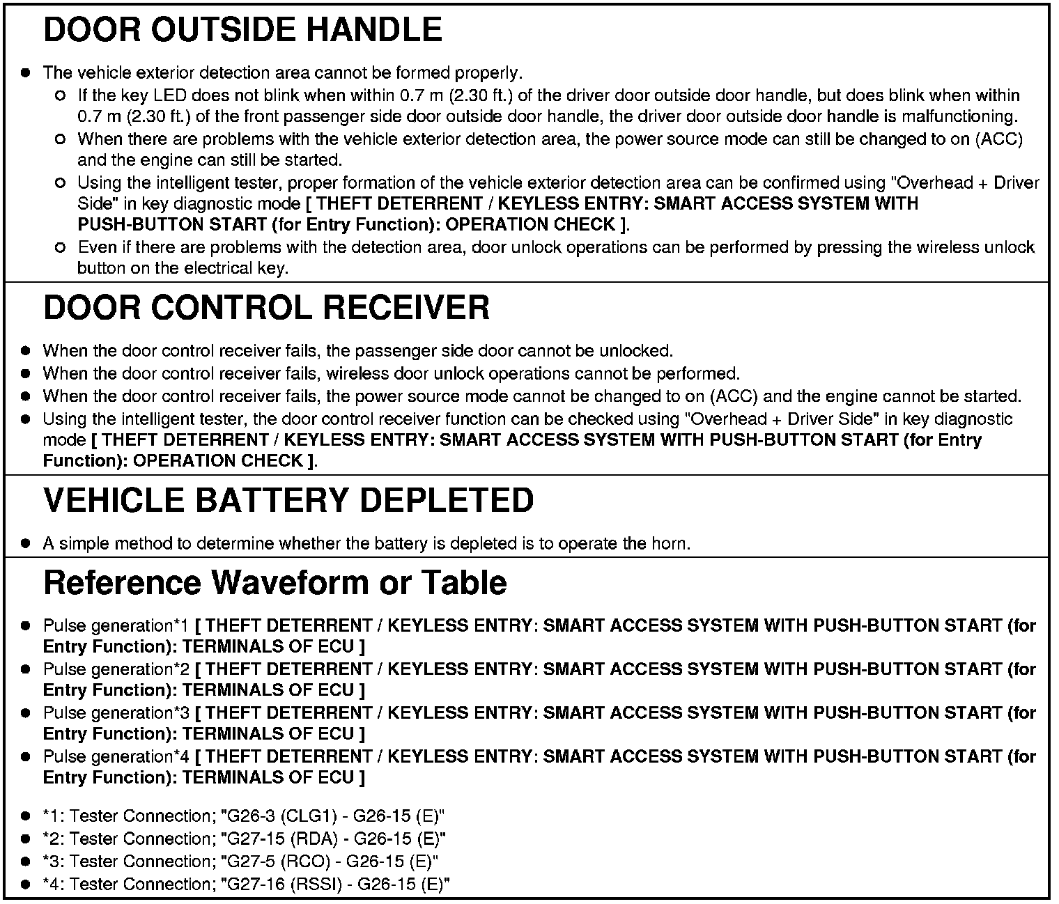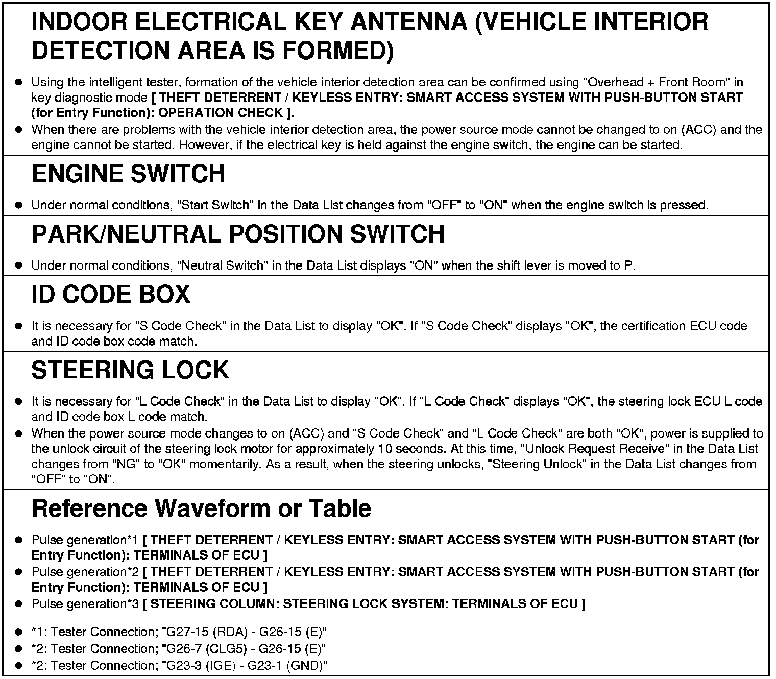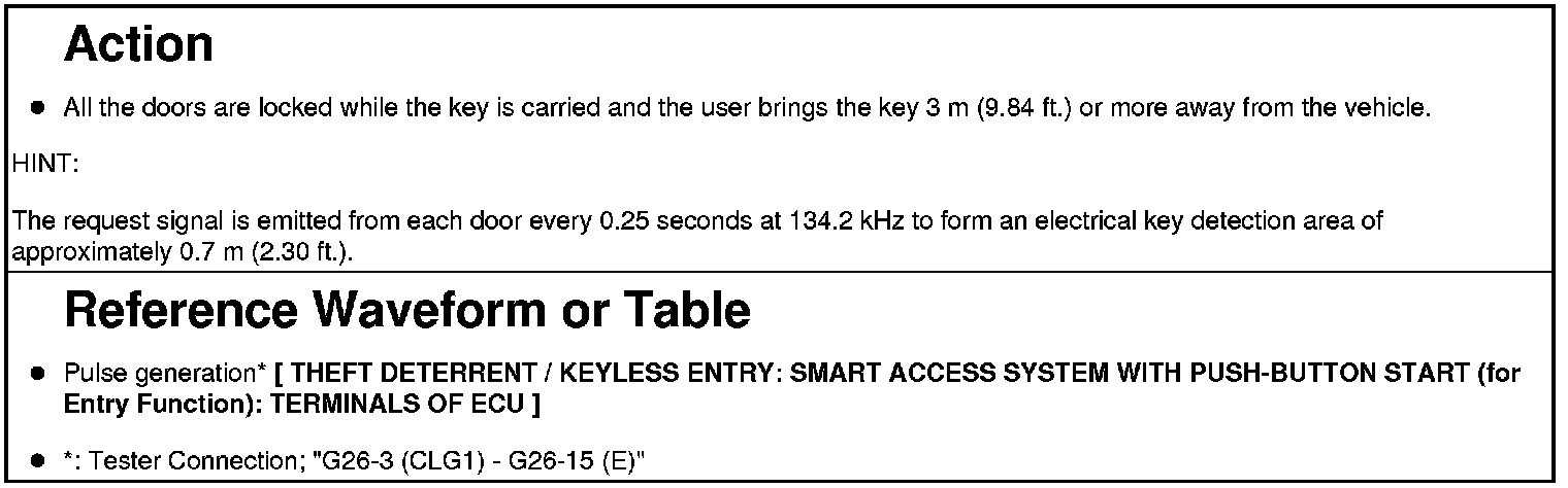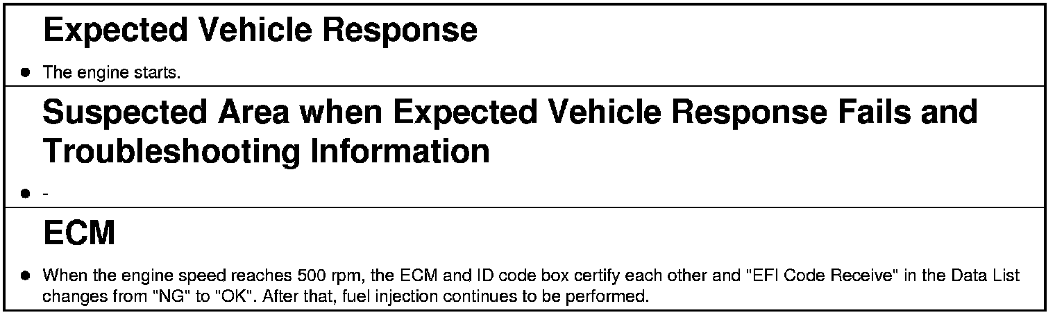 * The following example shows how the information in this section is organized. The "Action" item indicates actions the user performs related to the entry and start system, and the "Expected Vehicle Response" item indicates the normal vehicle behavior in response to those actions. The suspected problem areas when the vehicle does not behave as expected and troubleshooting hints for each area are listed under "Suspected Area when Expected Vehicle Response Fails and Troubleshooting Information".