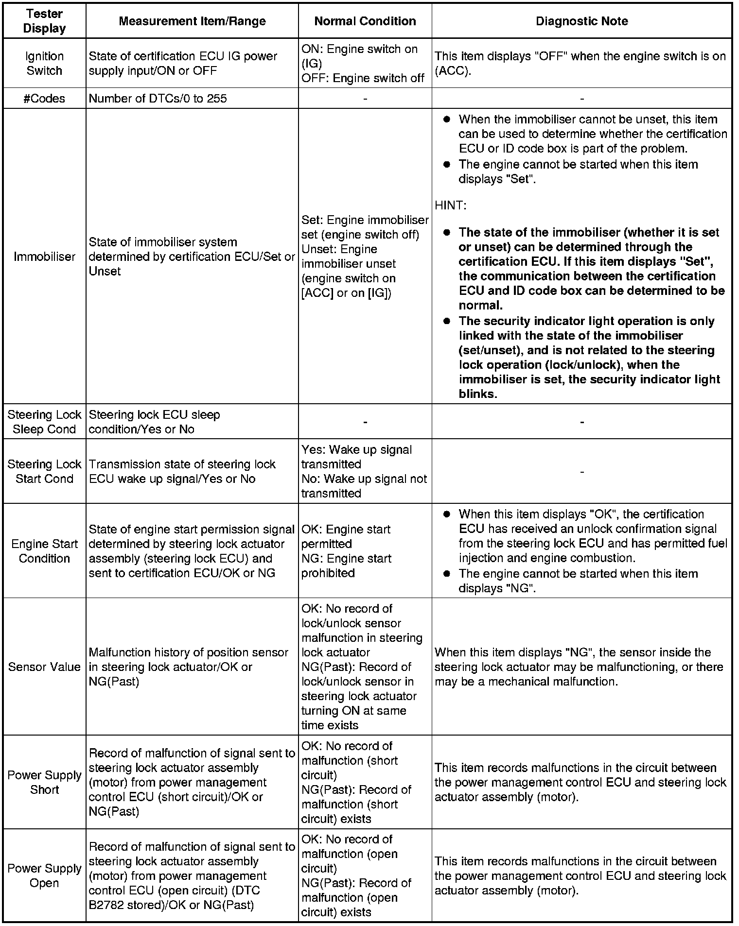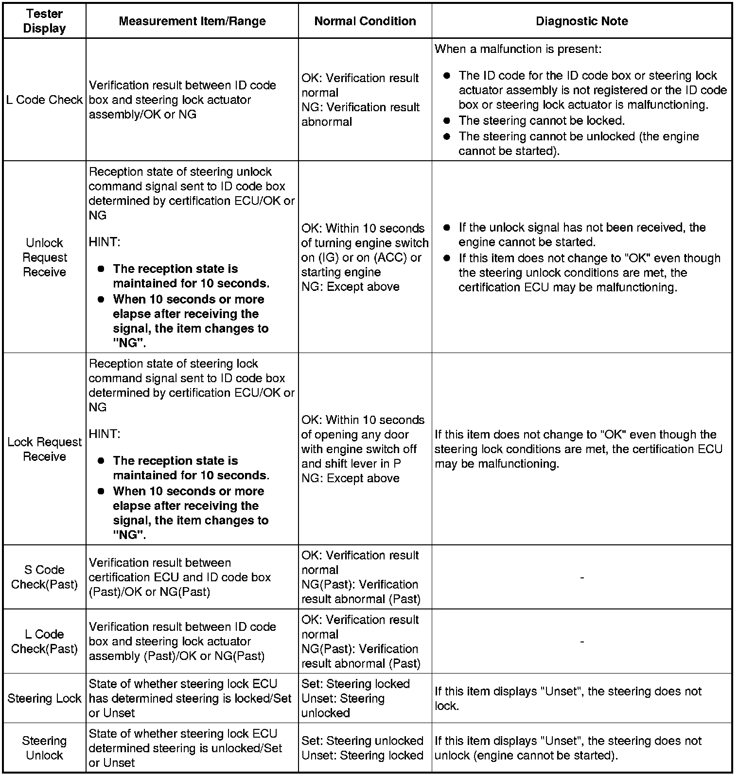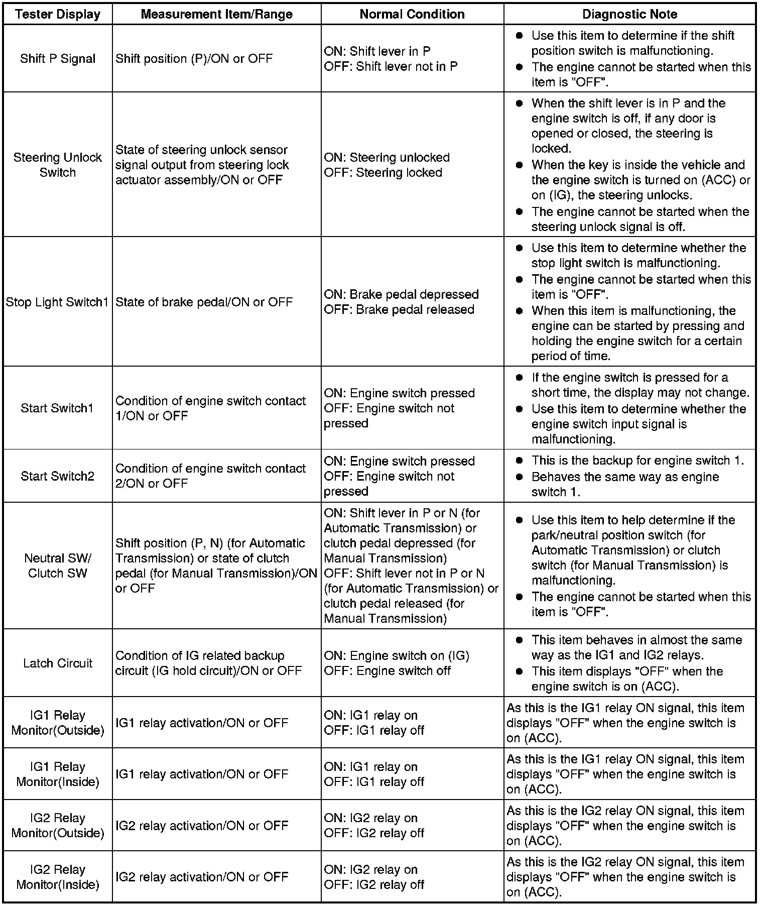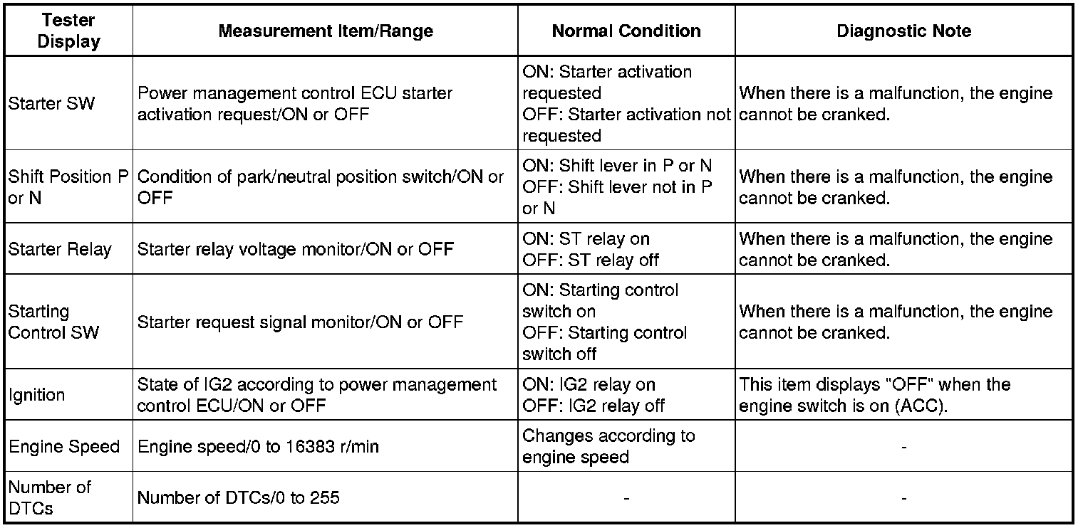Using the Techstream to read the Data List allows the values or states of switches, sensors, actuators and other items to be read without removing any parts. This non-intrusive inspection can be very useful because intermittent conditions or signals may be discovered before parts or wiring is disturbed. Reading the Data List information early in troubleshooting is one way to save diagnostic time.