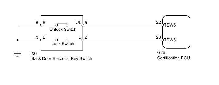 If the entry lock function does not operate for the back door only, but the entry unlock function operates, the request code is being transmitted properly from the back door. In this case, there may be a problem related to the lock switch (connection between the back door electrical key switch and certification ECU).