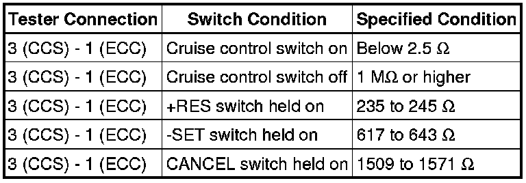 This circuit sends a signal to the ECM depending on the cruise control switch condition. The battery supplies positive (+) battery voltage to the cruise control switch. Terminal 11 (CCS) of the ECM receives the voltage which varies according to the switch condition.