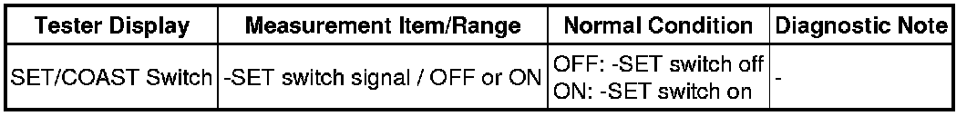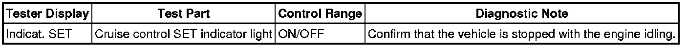 * When the ECM detects a cruise control switch on signal from the cruise control switch, the ECM sends the signal to the combination meter assembly through CAN communication. Then the cruise control SET indicator light turns on.