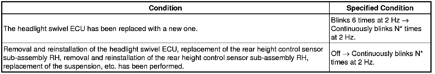 * If the vehicle is not equipped with the air suspension system, initialize the headlight swivel ECU (set the zero point of the height control sensor in the headlight swivel ECU) after the vehicle height changes due to replacement of suspension components or after performing such operations as removal and reinstallation or replacement of the rear height control sensor sub-assembly RH.