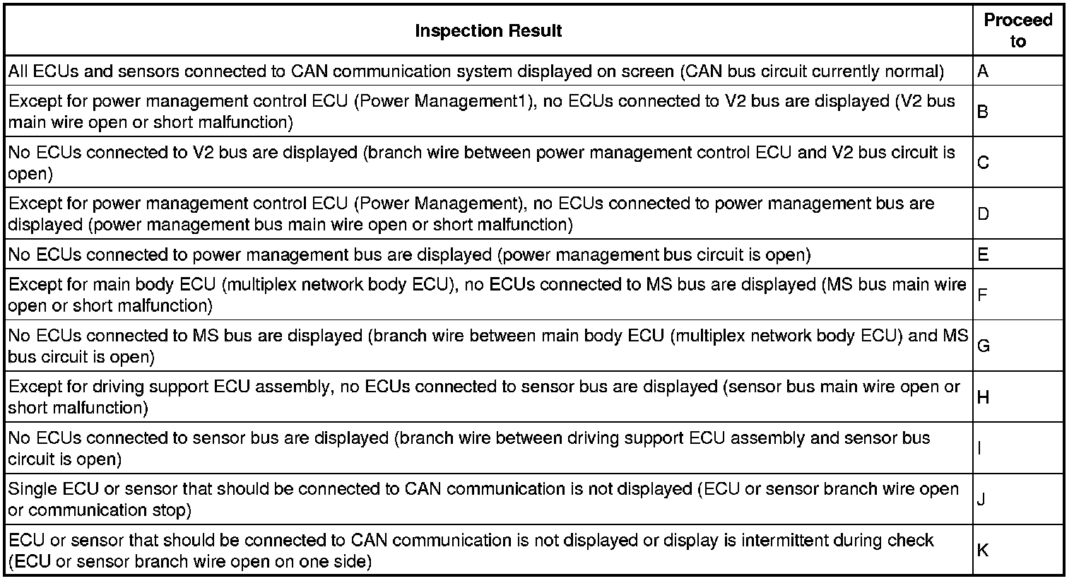 * When checking "CAN Bus Check", if a DTC indicating a CAN communication malfunction is output even though all ECUs (sensors) respond (they are displayed on the screen), use the DTC combination table to determine the suspected trouble area and perform symptom simulation.