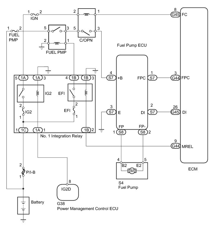 NG -- CHECK HARNESS AND CONNECTOR (CIRCUIT OPENING RELAY (C/OPN) - FUEL PUMP RELAY (F/PMP) AND NO. 1 INTEGRATION RELAY)
