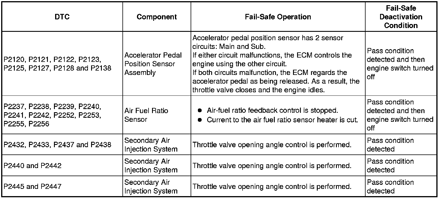 If any of the following DTCs are stored, the ECM enters fail-safe mode to allow the vehicle to be driven temporarily.