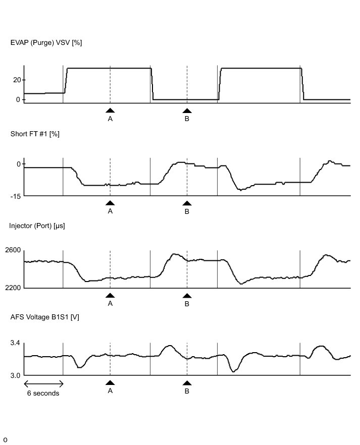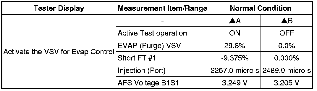 Even when the Active Test is turned on (the purge VSV is opened 30%), air-fuel ratio feedback continues and control is performed so that the air-fuel ratio is the stoichiometric ratio. Therefore, by observing the change in "Short FT", it is possible to determine whether the purge VSV is actually open as well as the concentration of HC in the purge gas.