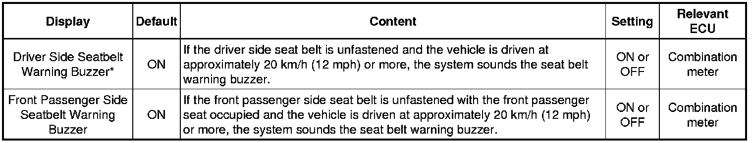 * *: The buzzer which sounds at an interval of 1.2 seconds 5 times when the engine switch is turned on (IG) while the driver side seat belt is not fastened cannot be disabled.