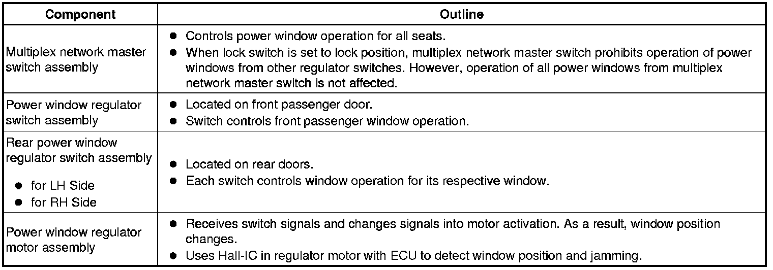 (a) The power window control system controls the power window operation using the power window regulator motors. The main controls of this system are the multiplex network master switch, which is mounted on the driver side door, the power window regulator switch, which is mounted on the front passenger door, and the power window regulator switches, which are mounted on the rear doors. Operating a window switch results in electrical power being transmitted to the corresponding power window regulator motor.