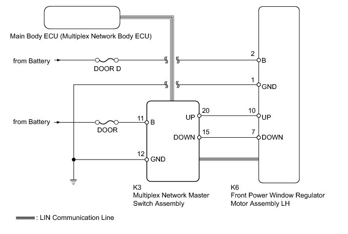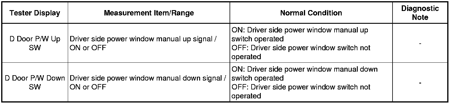 * If the manual up/down function does not operate, there may be a malfunction in the multiplex network master switch, power window regulator, harness or connector.