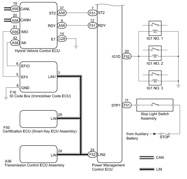 When the electronic key is in the cabin and the power switch is pressed, the power management control ECU receives a signal and changes the power source mode. In addition, when the power switch is pressed with park (P) selected and the brake pedal depressed, the hybrid system turns on (READY).