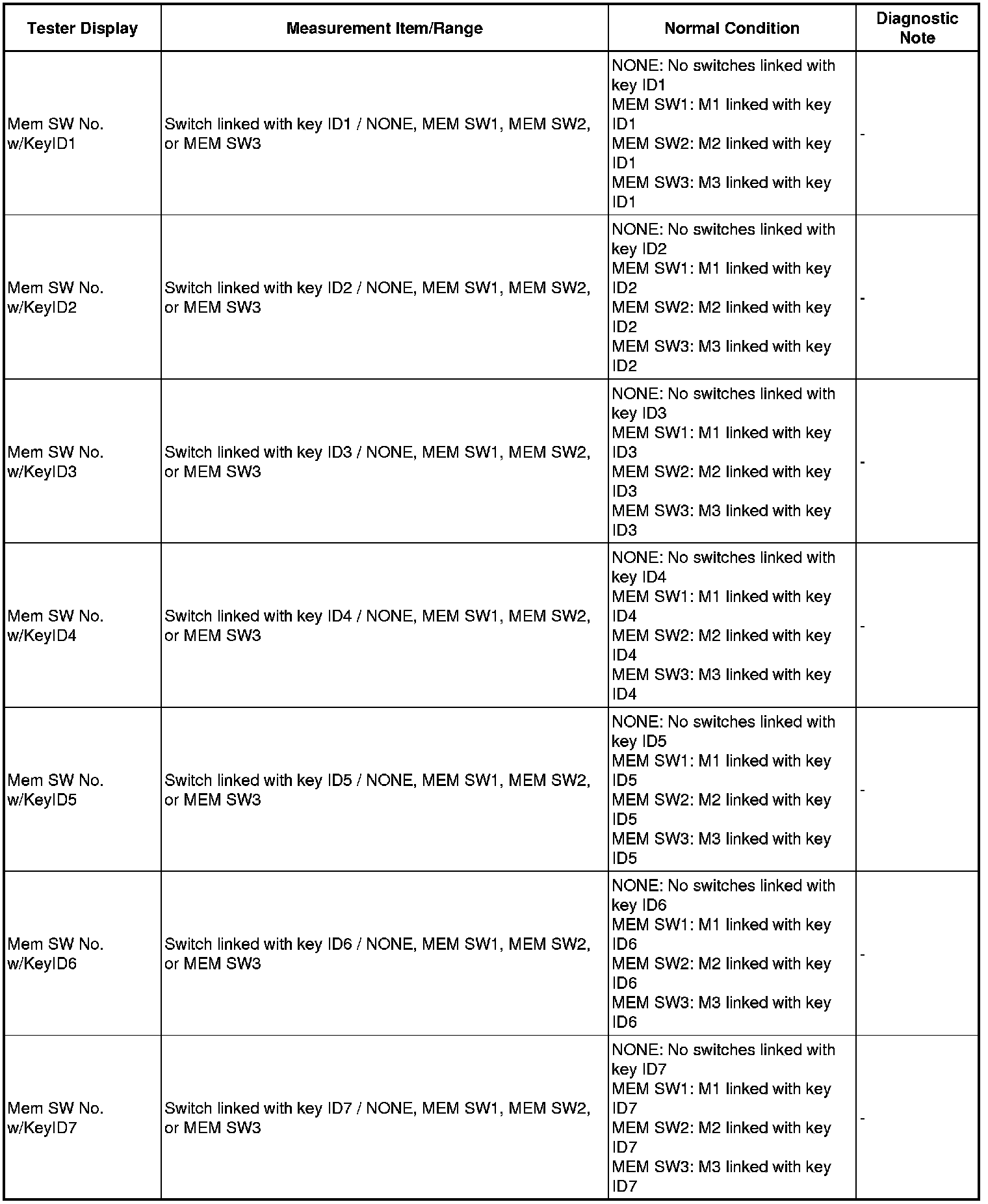 The key ID can be registered to be linked with each of the M1, M2 and M3 seat memory switches. The key ID registration procedure should be performed while the electrical key transmitter is in the vehicle, the power switch is on (IG), and the driver door is closed. When the registration is completed, the buzzer will sound as an answerback.