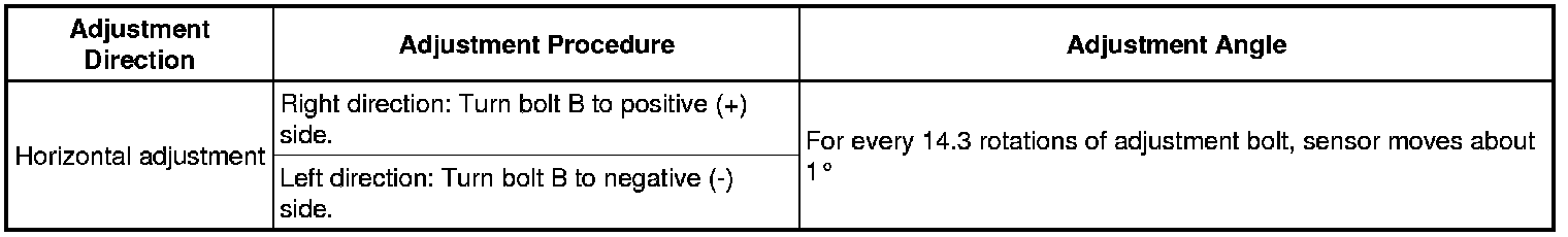 * If "LEFT SIDE: 1.0°" is displayed, the divergence is 1.0° in the left direction. Turn bolt B approximately 2.5 turns to the negative (-) side.