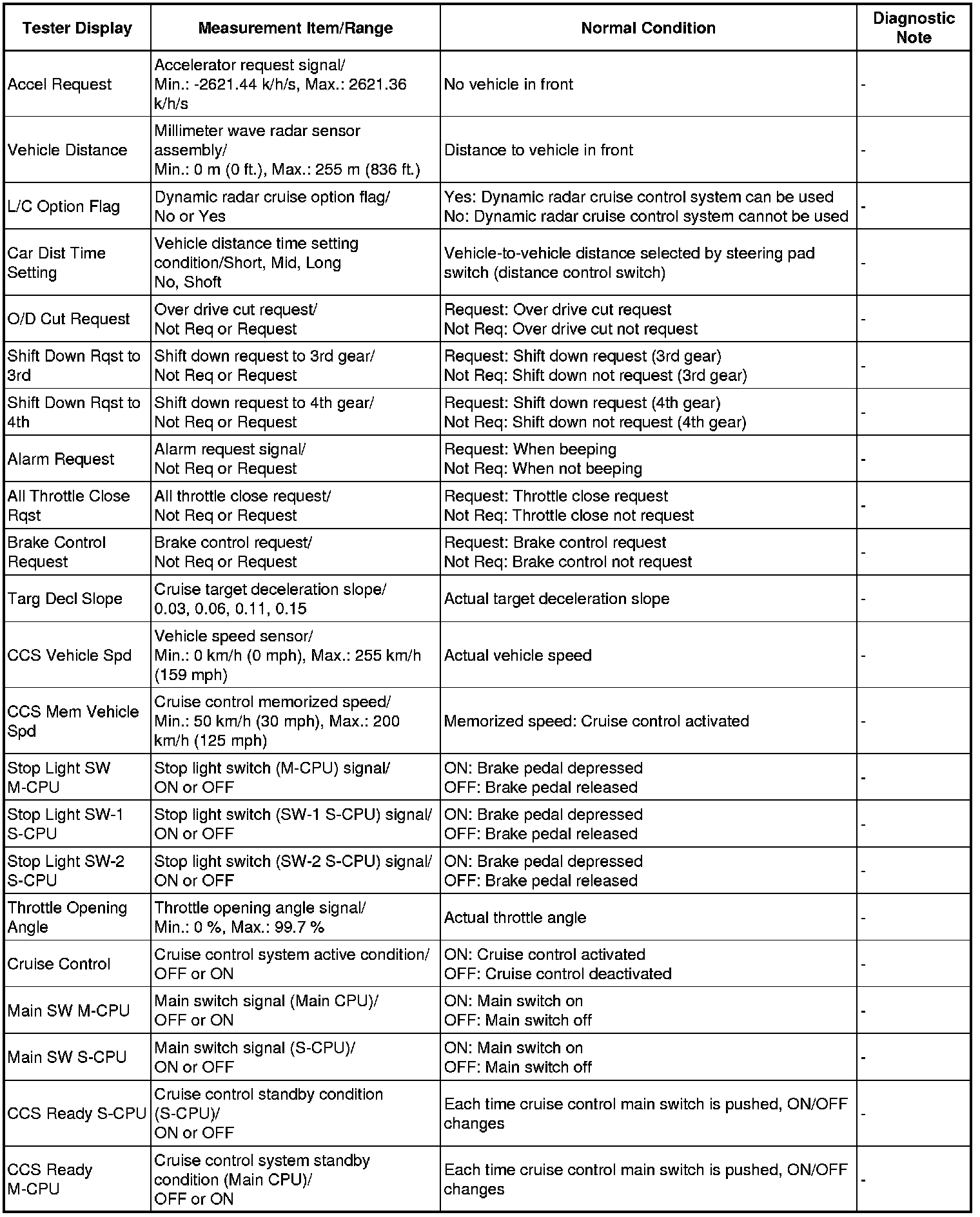 (d) Enter the following menus: Powertrain / Radar Cruise / Data List.