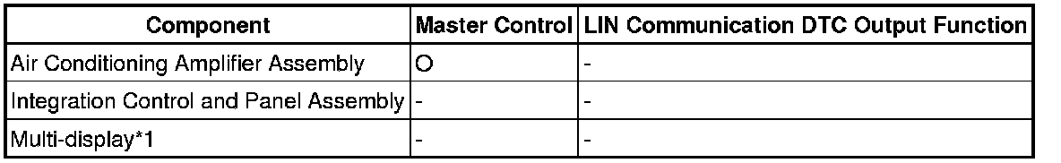 The LIN communication system is used for communication between the components in the tables below. If communication cannot be performed through LIN communication because of an open in the communication lines or other reason, the master control ECU of the relevant system will output a DTC. Refer to the table below about the communication bus lines and connected components.
