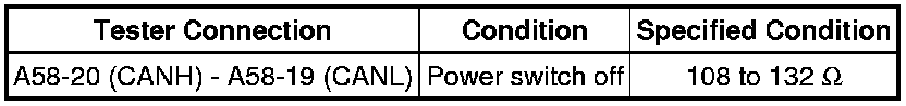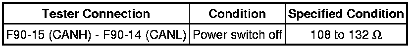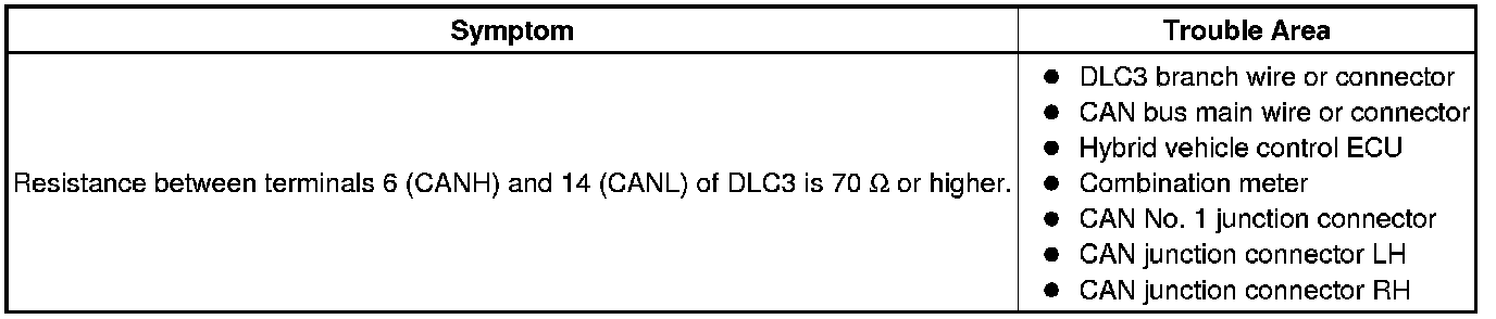There may be an open circuit in the CAN No. 1 bus main wire and/or the DLC3 branch wire when the resistance between terminals 6 (CANH) and 14 (CANL) of the DLC3 is 70 Ohms or higher.