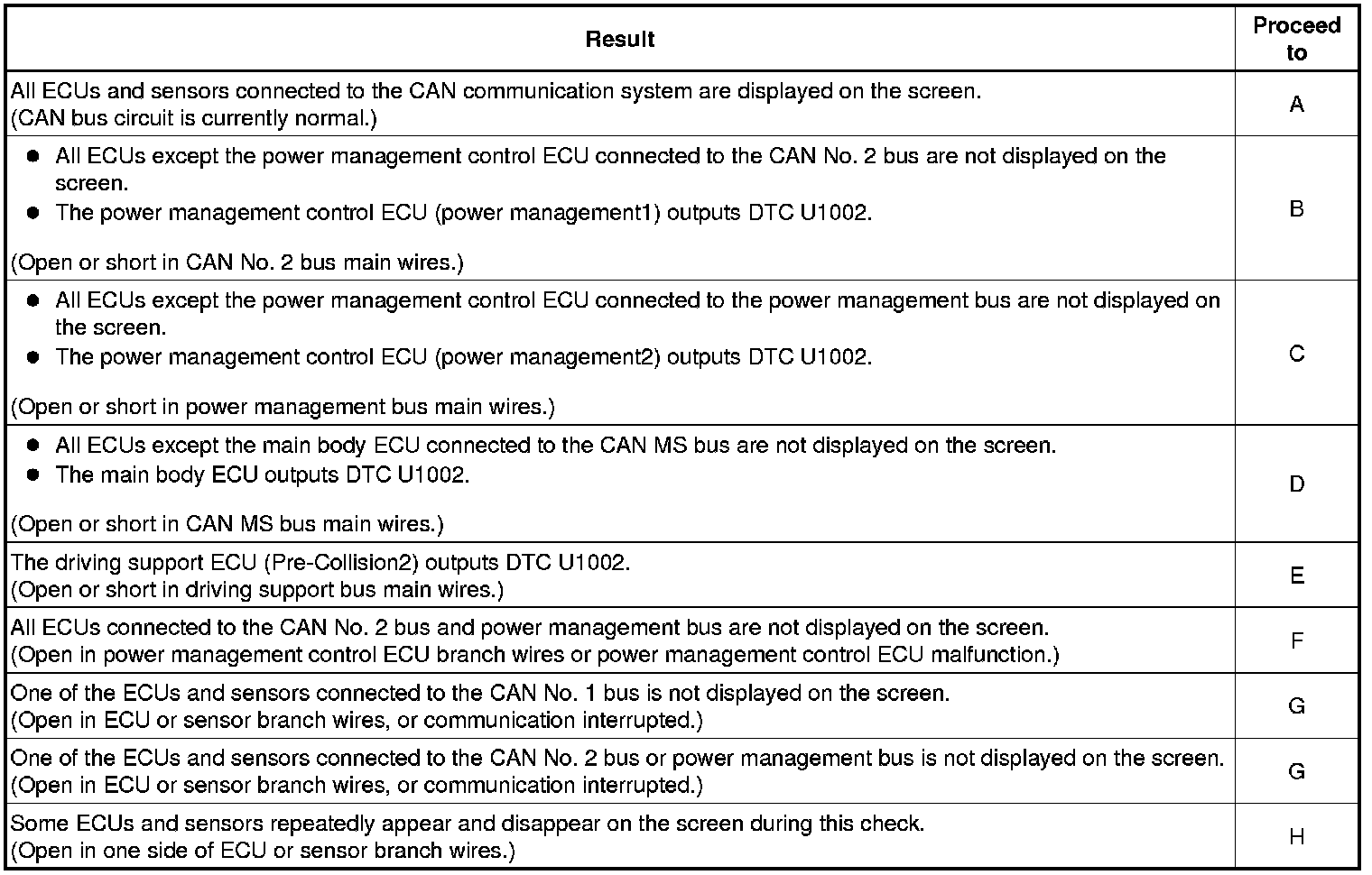 * ECUs related to a problem in the CAN bus will store DTCs to indicate communication malfunctions. Communication stop mode in the CAN bus can be determined by comparing the combination of DTCs that have been set. Refer to DTC Combination Table for the CAN bus.