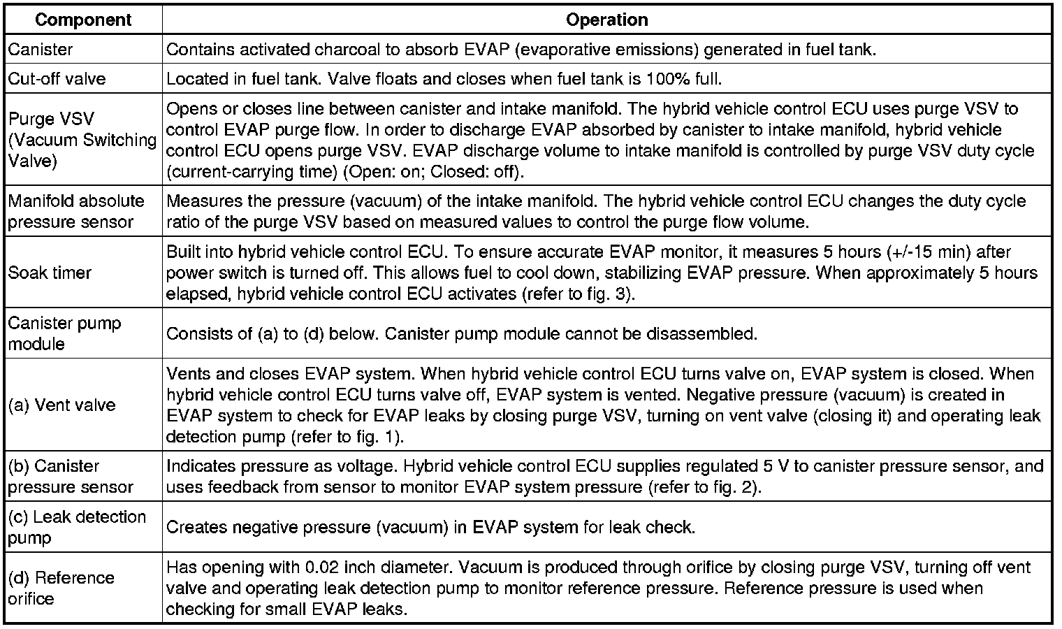 The leak detection pump creates negative pressure (vacuum) in the EVAP system and the pressure is measured. Finally, the hybrid vehicle control ECU monitors for leaks from the EVAP system, and malfunctions in both the canister pump module and purge VSV based on the EVAP pressure.