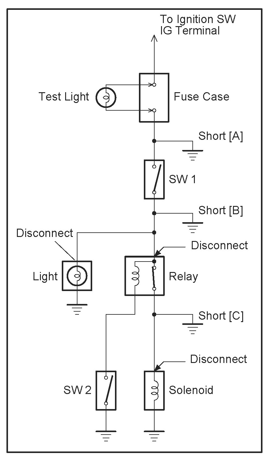 The short lies between the connector where the test light stays lit and the connector where the light goes out.