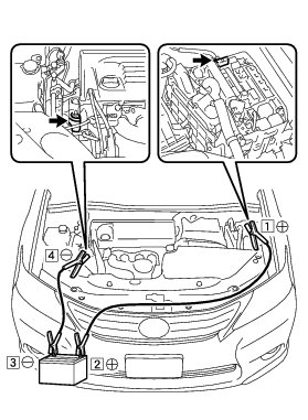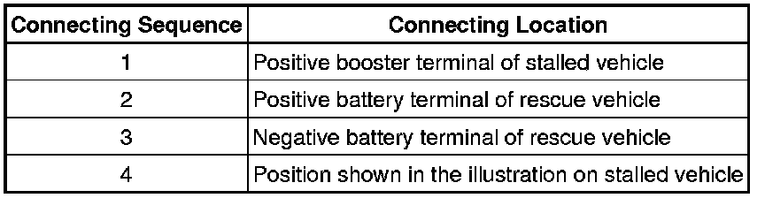 (4) Using booster cables, connect the 12 V battery of the rescue vehicle and the auxiliary battery of the stalled vehicle as shown in the illustration.
