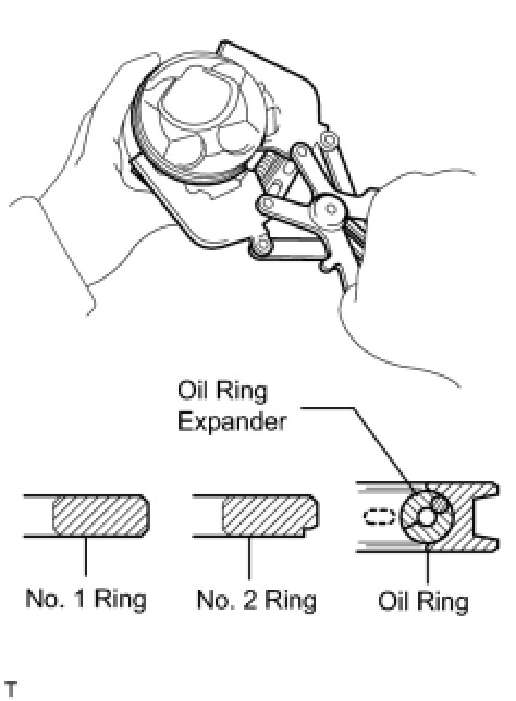 (b) Using a piston ring expander, install the oil ring rail and 2 compression rings as shown in the illustration.