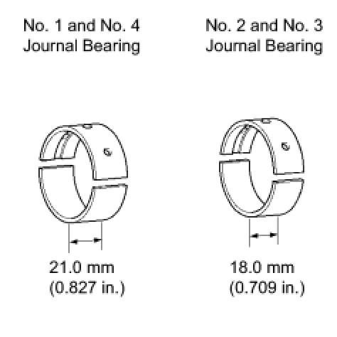 Main bearings come in widths between 18.0 mm (0.709 in.) and 21.0 mm (0.827 in.). Install the 21.0 mm (0.827 in.) bearings in the No. 1 and No. 4 cylinder block journal positions with the main bearing cap. Install the 18.0 mm (0.709 in.) bearings in the No. 2 and No. 3 positions.