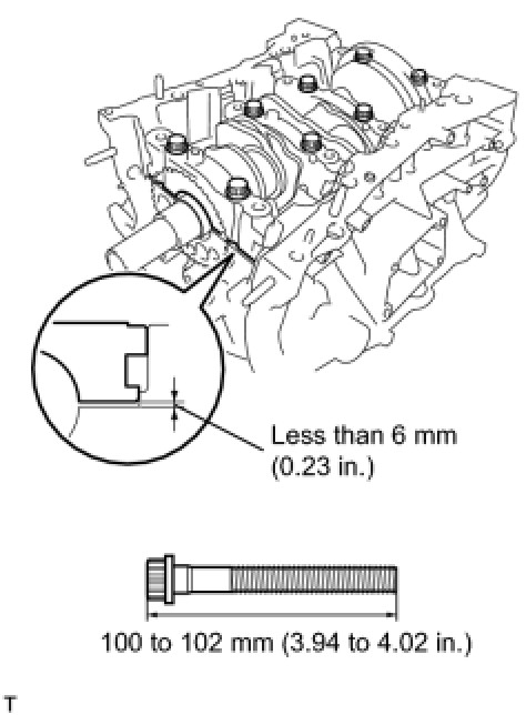 (e) Insert the main bearing cap by hand until the clearance between the main bearing cap and the cylinder block is less than 6 mm (0.23 in.) by marking the 2 internal bearing cap bolts as a guide.