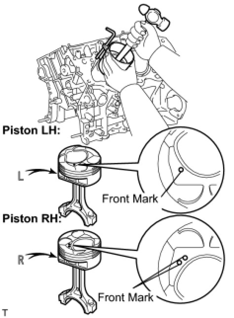 (d) Align the front marks of the piston and connecting rod, and push in the piston pin with your thumb.
