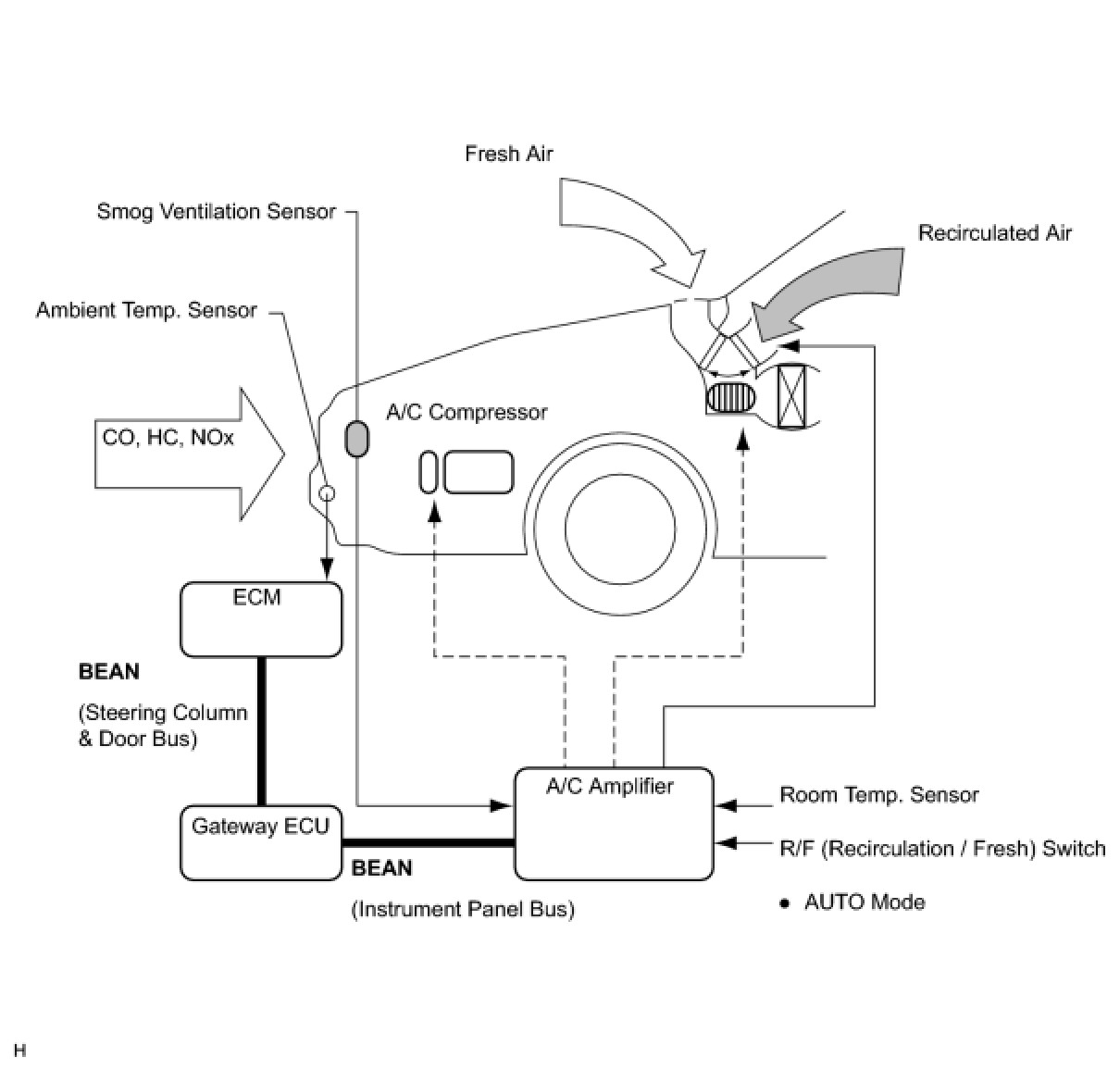 (1) The A/C amplifier detects harmful elements (CO, HC, and NOx) based on smog ventilation sensor signals and automatically switches the air inlet mode to the recirculate air mode to prevent such harmful elements from entering the cabin.