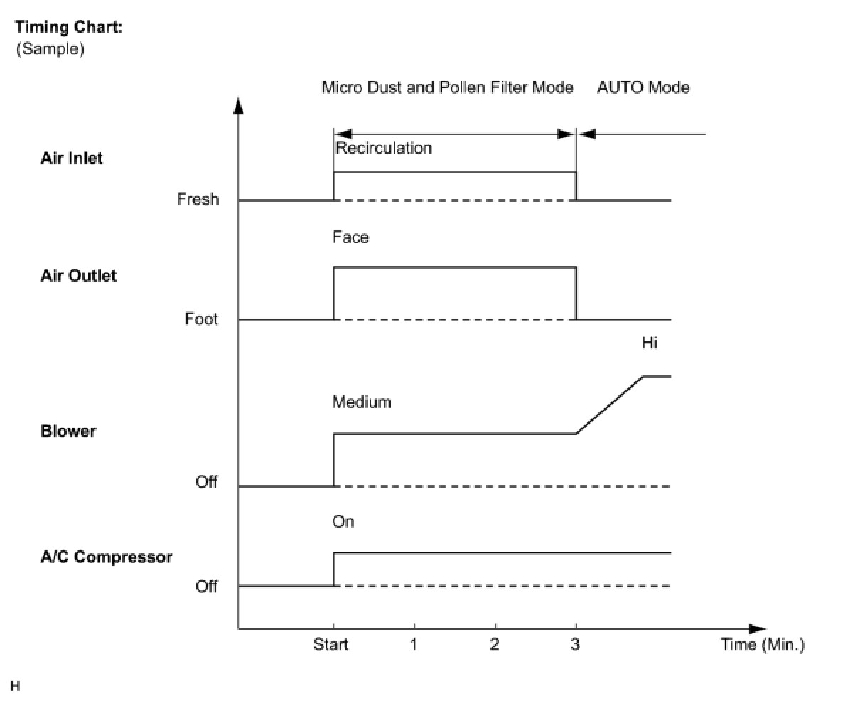 (1) When the micro dust and pollen filter switch signal is input to the A/C amplifier, the A/C amplifier controls the A/C compressor, air inlet control servo motor, air outlet control servo motor and blower motor as shown in the timing chart below.