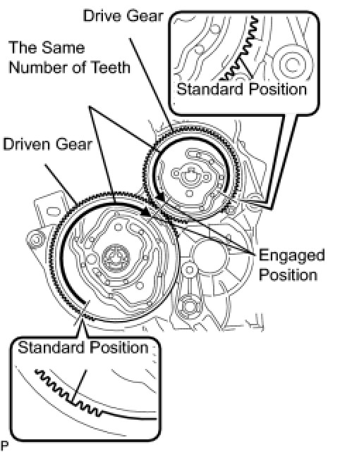 * If there is not the same number of gear teeth from the standard position on each gear at the point where the two gears are engaged, remove the drive gear, adjust the driven gear, and reinstall the drive gear.