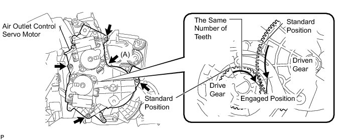(d) Slightly lift the air outlet control servo motor. Check that the drive gear and the driven gear are engaged at a point with the same number of gear teeth from the standard position from the view indicated by arrow (A).