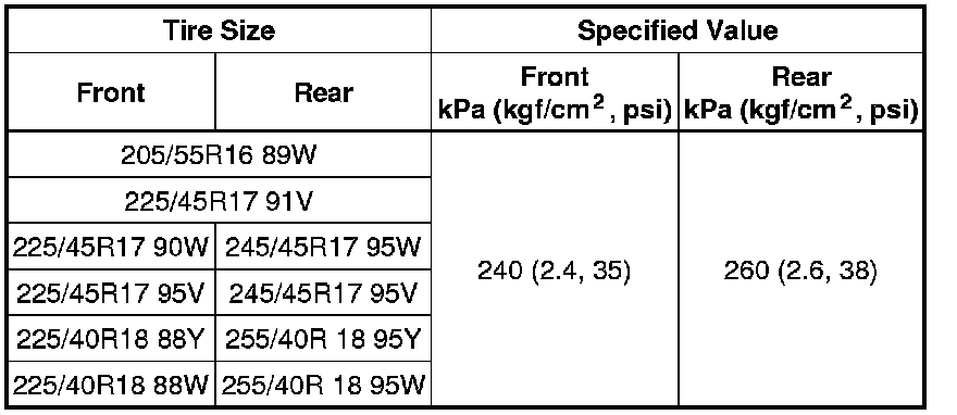 * In winter, tire pressure may decrease due to low ambient temperatures (tire pressure decreases by approximately 10 kPa (0.1 kgf/cm2, 1.45 psi) for every 10°C (50°F) drop in the ambient temperature).